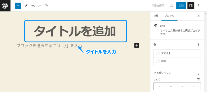 タイトルを追加」をクリックし、記事タイトルを入力します。