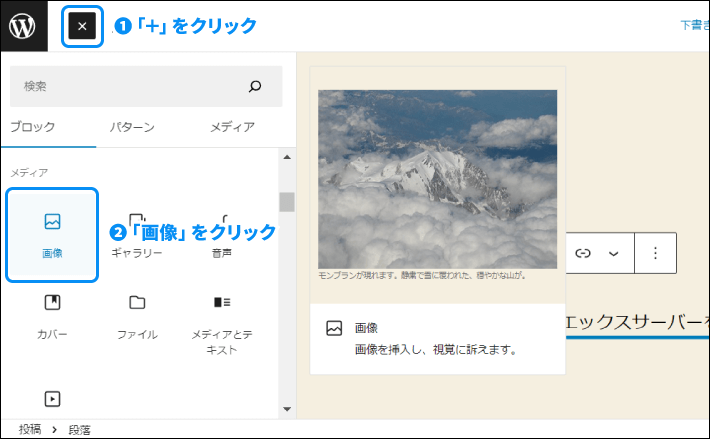 左上の「」アイコンをクリックし、「メディア」から「画像」をクリックします。