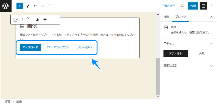 新たに画像をアップロードする場合は「アップロード」、すでにアップロードしているファイルを利用する場合は「メディアライブラリ」をクリックします。画像URLを直接指定したい場合は「URLから挿入」をクリックしてください。