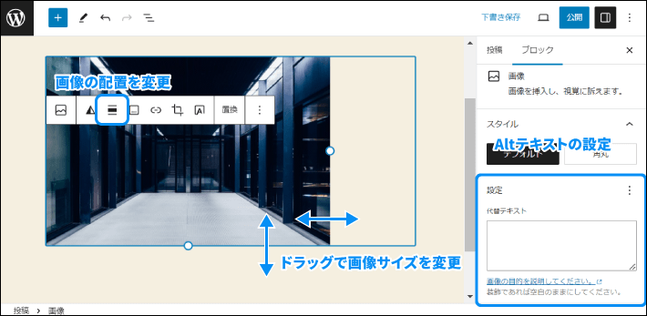 画像の位置や大きさの調整、Altテキスト(リンク切れなどで画像表示できない時の代替テキスト)の設定ができます。