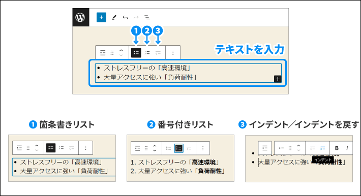 リストは箇条書きだけでなく、番号付きのリストにもできます。項目によって使い分けましょう!
