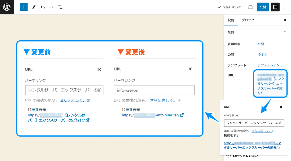 設定サイドバーの「URL」のリンクをクリックして、パーマリンクを英語表記に書き換えます