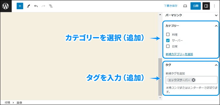 設定サイドバー「カテゴリー」または「タグ」をクリックして、カテゴリーやタグを設定します。