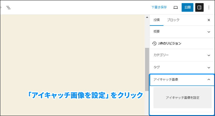 設定サイドバー「アイキャッチ画像」を選択し、「アイキャッチ画像を設定」をクリックします。