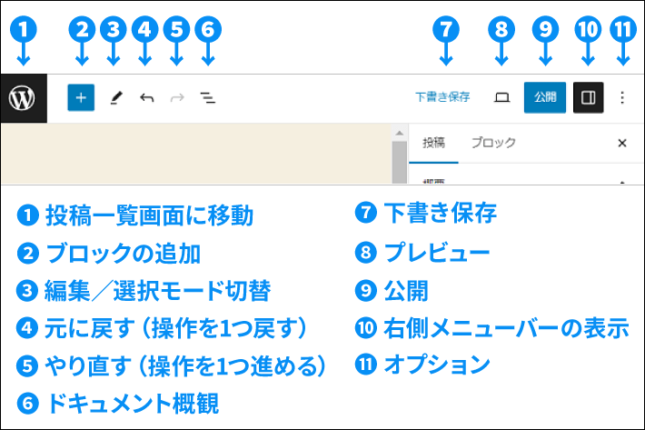 記事を書く際は「2」のブロック追加や、「7~9」の公開関連のボタンをよく使います。