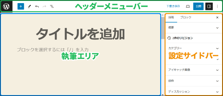 文章は「執筆エリア」に書き、個々のブロック設定や公開に関する設定は「設定サイドバー」で行います。「ヘッダーメニューバー」ではブロックの追加や下書き保存などを行います。