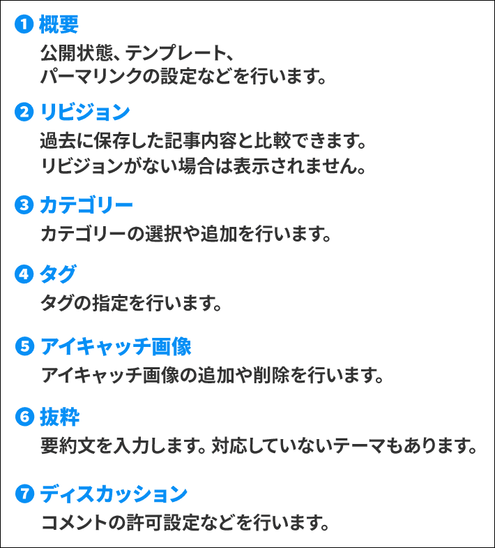 記事ができたら、公開に向けた準備や設定を行います。