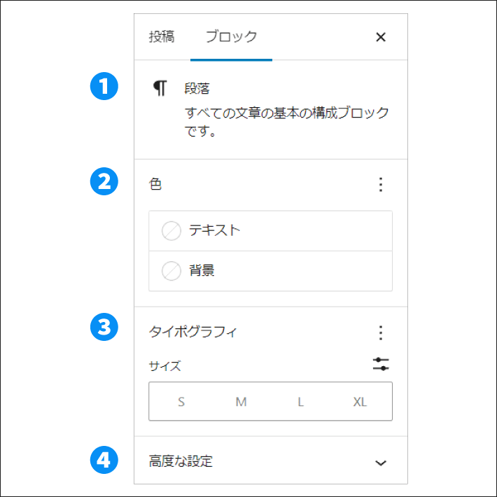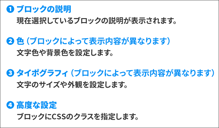 選択しているブロックや設定によって表示項目が変わりますのでご注意ください!