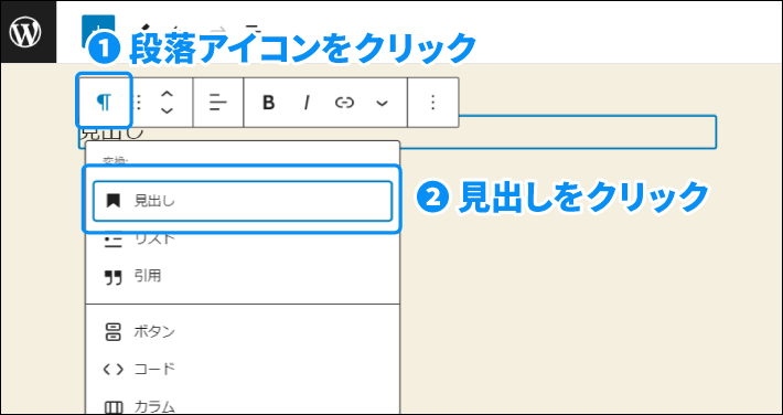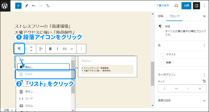 ブロックメニューの段落アイコンをクリックして、変換したいブロックをクリックします。入力内容を保持したまま、ブロックタイプの変換ができて良いですね!