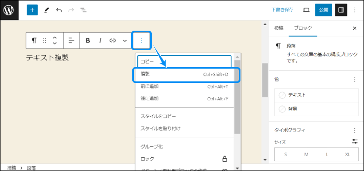 ブロックメニューの詳細設定から「複製」をクリックします。