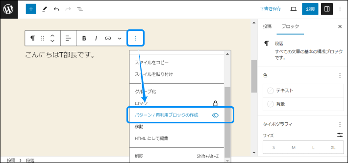 ブロックメニューの詳細設定から「パターン/再利用ブロックの作成」をクリックします。