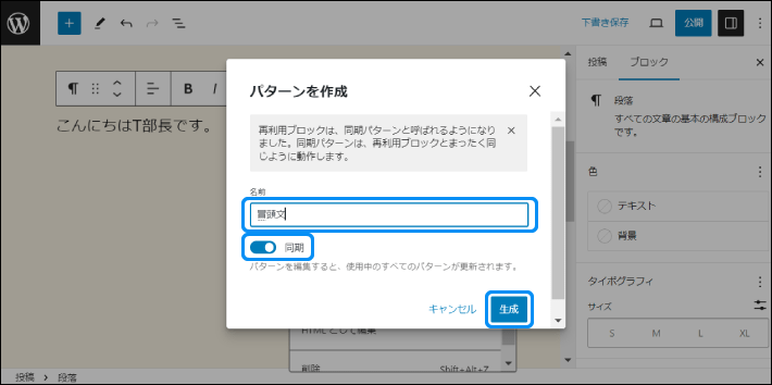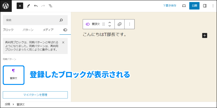 たったこれだけで、「同期パターン」として他の記事でもブロックが呼び出せます!