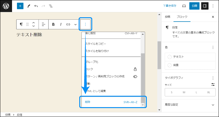 ブロックメニューの詳細設定から、「削除」をクリックするだけで削除できます。執筆の邪魔になるので、不要なブロックは削除しましょう!