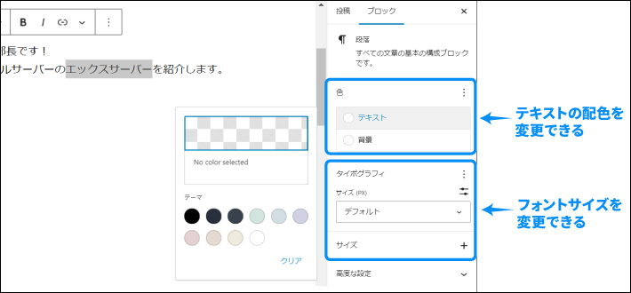 フォントサイズ」や「文字色」の変更は、設定サイドバーで行います。