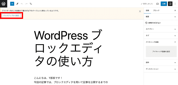 WordPressには、自動保存の機能が標準で備わっています。文章を入力中、定期的に自動で保存してくれる便利な機能です。