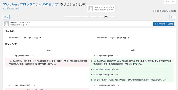 リビジョンでは、編集の差分を確認でき、復元して過去の状態に戻すことも可能です。