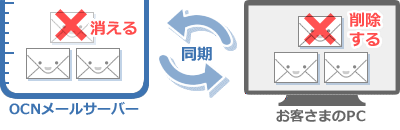 IMAPで設定した場合は、メールソフトやアプリとサーバーの内容が常に同期され、同じ状態に保たれます。例えば、お客さまがIMAP設定のメールソフトで削除したメールは、サーバーからも削除されます。