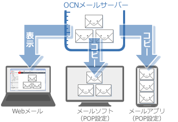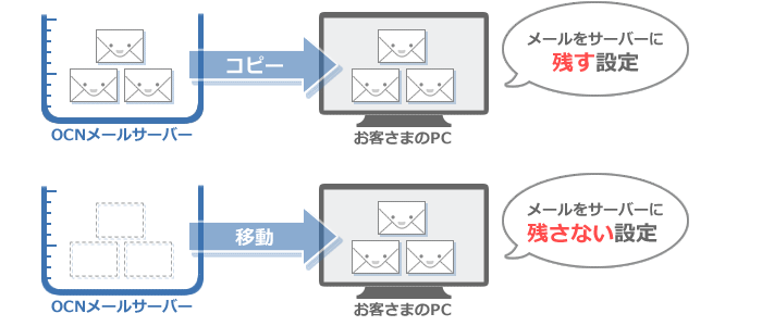 メールソフトやアプリをPOPという方式で設定すると、サーバーのメールをお客さまのPCやスマホにダウンロードして表示します。このときに、メールのコピーをサーバーに残すか残さないかを選択することができます。